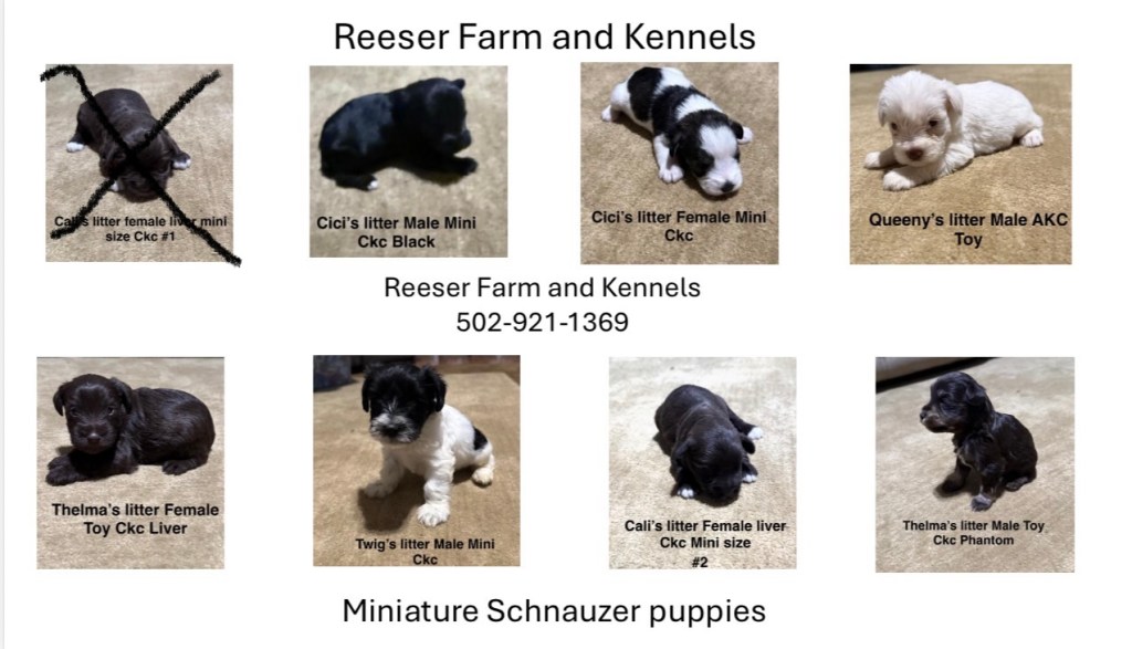 Feel free to contact us at 502-921-1369 or by email at Reeserfarms@yahoo.com or visit our Facebook Page at Reeser Farm and Kennels to see our reviews. We will be happy to answer any questions you may have. Thanks pooand have a wonderful day!